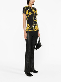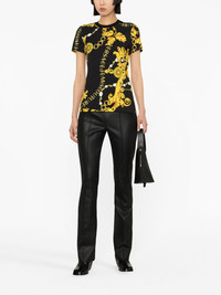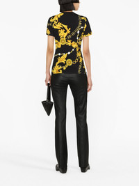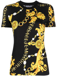 Logo Couture-print T-shirt Versace Jeans Couture spotlights its maximalist aesthetic with this cotton-blend T-shirt. It’s enlivened with a custom Logo Couture print comprising swirling gold-tone vines and chain-link lettering. Highlights - Black/gold-tone - Stretch-cotton - Baroque-pattern print - All-over logo print - Crew neck - Short sleeves - Straight hem Imported Composition Cotton 87%, Spandex/Elastane 13% SIZE & FIT Model measurements Height 5 ft 10 in(1.78 m) Bust/Chest 29.92 in(76 cm) Hips 34.64 in(88 cm) Waist 23.62 in(60 cm) FittingInformation Designed for a slim fit that sits just away from the body offering a close yet comfortable fit Made from a midweight stretch fabric, this piece offers elasticity and flexibility when worn This piece fits true to size – take your usual size