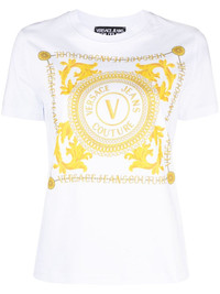 Logo Couture print T-shirt Made from soft white cotton, this T-shirt from Versace Jeans Couture is emblazoned with a gold-tone iteration of the house's iconic Logo Couture print — a nod to opulent motifs and stylised designs. Highlights - White/gold-tone - Cotton - Logo print to the front - Round neck - Short sleeves - Straight hem Imported Composition Cotton 100% SIZE & FIT Model measurements Height 5 ft 10 in(1.78 m) Bust/Chest 29.92 in(76 cm) Hips 34.64 in(88 cm) Waist 23.62 in(60 cm) FittingInformation Designed for a relaxed fit, this piece allows for comfort and movement when worn Made from a midweight non-stretch fabric, this piece offers minimal elasticity when worn This piece fits true to size – take your usual size