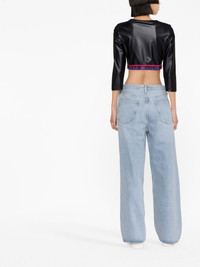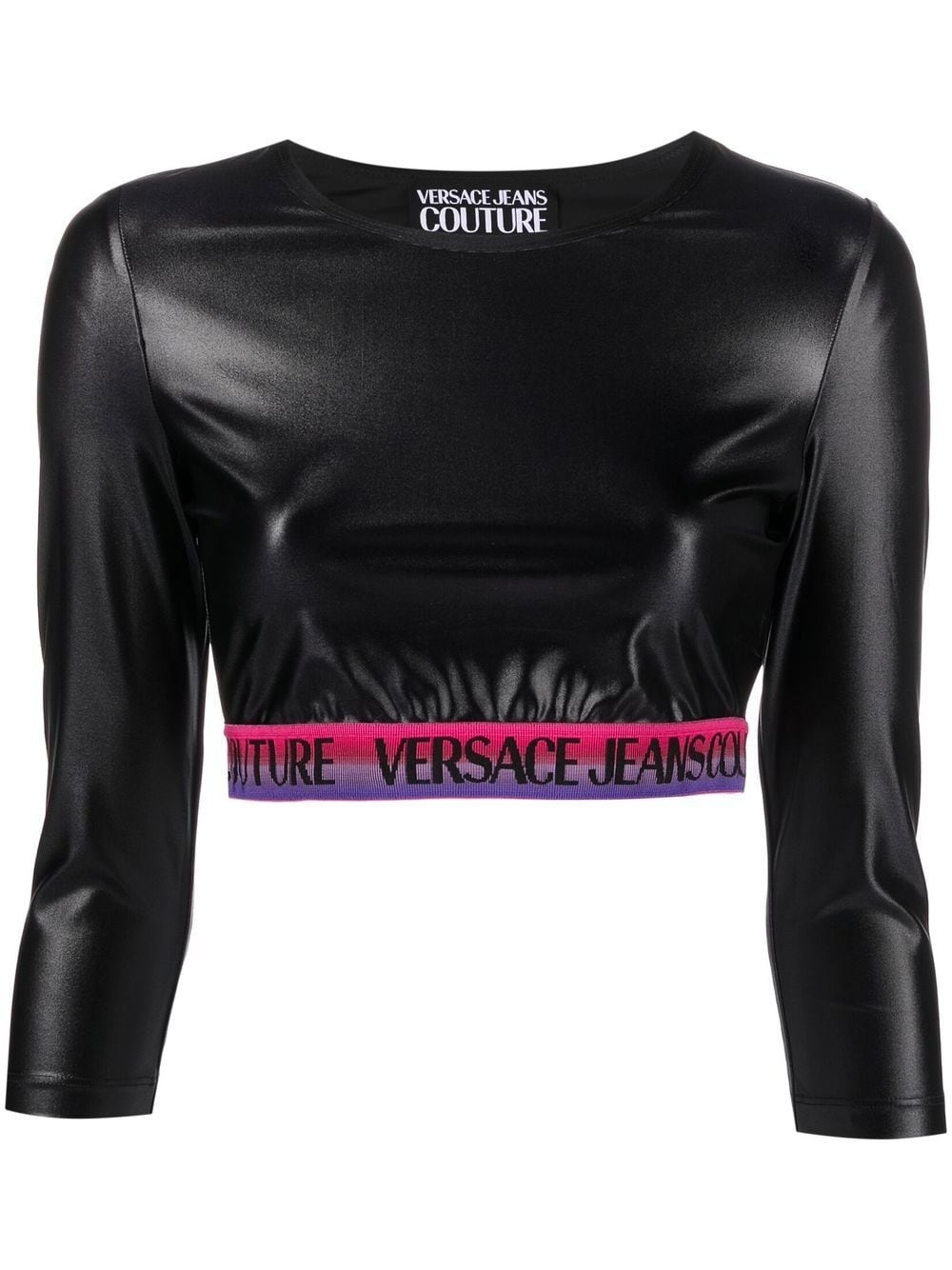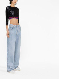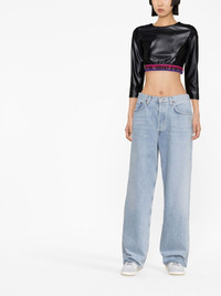 logo cropped top black cropped logo waistband round neck single three-quarter length sleeve Imported Composition Nylon 79%, Elastane 21% SIZE & FIT Model measurements Height 5 ft 10 in(1.78 m) Bust/Chest 29.92 in(76 cm) Hips 34.64 in(88 cm) Waist 23.62 in(60 cm) FittingInformation This piece fits true to size. We recommend you get your regular size Cut for a slim fit Made with a mid-weight stretch fabric Washing instructions Machine Wash