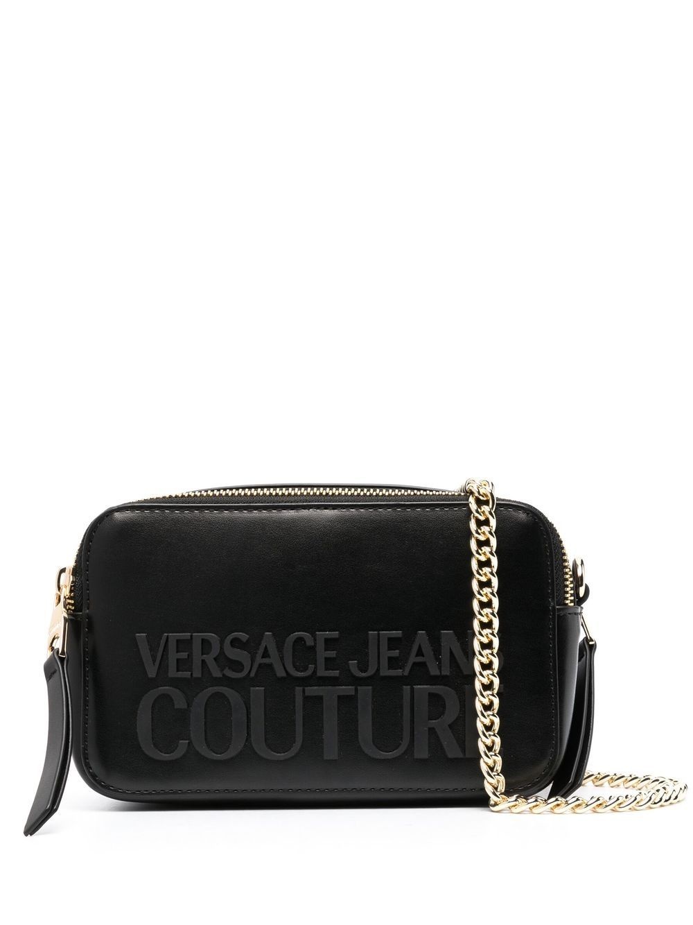 logo-lettering crossbody bag Boasting the brand's logo lettering to the front, this crossbody bag from Versace Jeans Couture is crafted from smooth faux leather in a black colourway. The piece is designed with two detachable chain-link shoulder straps for added styling options. Highlights - Black - Faux leather - Smooth grain - Logo lettering - Two chain-link shoulder straps - Top zip fastening - Two main compartments - Gold-tone hardware Imported Composition Outer: Polyurethane 100% SIZE & FIT Model measurements Height 5 ft 11 in(1.8 m) Bust/Chest 31.49 in(80 cm) Hips 36.41 in(92.5 cm) Waist 25.59 in(65 cm) Measurement DEPTH 3.14 in(8 cm) HEIGHT 4.72 in(12 cm) STRAP 19.68 in(50 cm) WIDTH 7.48 in(19 cm)