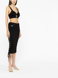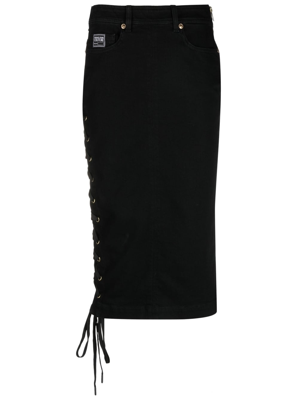 logo-patch pencil skirt Branding is integral to Versace Jeans Couture's design approach. This pencil skirt is finished with a logo patch at the side and turns to reveal signature gold-tone Medusa hardware. Imported Composition Outer: Cotton 98%, Spandex/Elastane 2% Lining: Polyester 65%, Cotton 35% SIZE & FIT Model measurements Height 5 ft 10 in(1.77 m) Bust/Chest 32.67 in(83 cm) Hips 35.43 in(90 cm) Waist 23.62 in(60 cm) FittingInformation This midi-length skirt is intended to be worn just below the waist This piece fits true to size – those with curvy hips may wish to take one size up Washing instructions Machine Wash