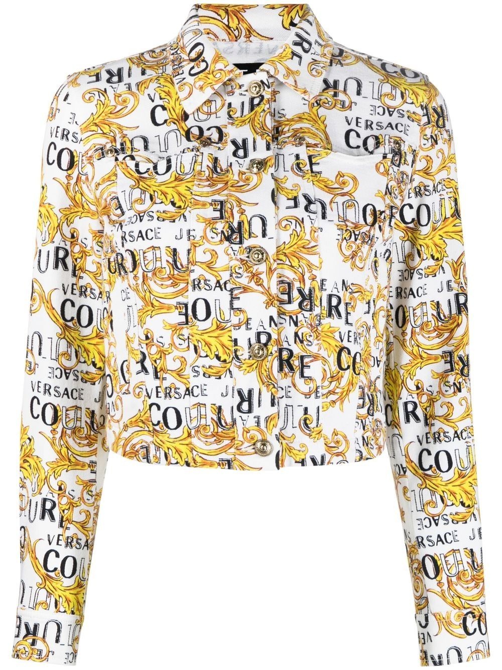 logo-print cropped jacket Versace Jeans Couture's bold design style conveys this cropped jacket through the use of logo print detailing and the brand's signature baroque pattern. Made in Italy Composition Lining: Polyester 65%, Cotton 35% Outer: Cotton 97%, Spandex/Elastane 3% SIZE & FIT Model measurements Height 5 ft 10 in(1.77 m) Bust/Chest 32.67 in(83 cm) Hips 35.43 in(90 cm) Waist 23.62 in(60 cm) FittingInformation This piece fits true to size. We recommend you get your regular size Cut for a slim fit Made with a mid-weight stretch fabric Washing instructions Machine Wash