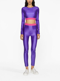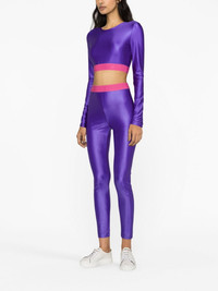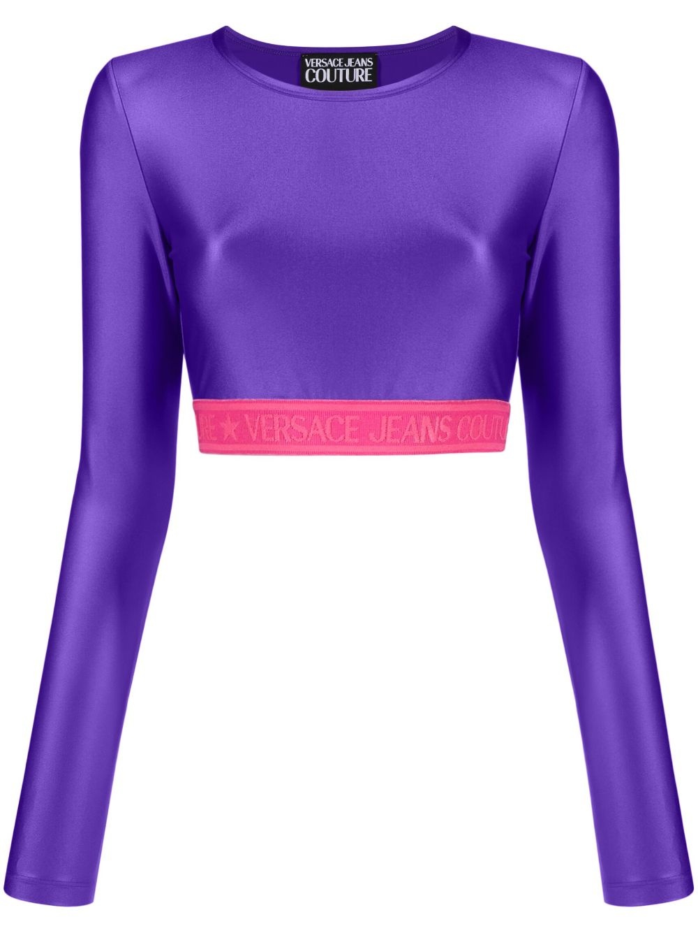 logo-underband crop top This Versace Jeans Couture crop top channels outer space thanks to its stretchy lustrous fabric and violet purple hue. A pink logo underband frames the piece in an unmistakable fashion. Highlights - Violet purple - Logo underband - Stretch-design - Round neck - Long sleeves - Straight hem - Cropped Imported Composition Polyamide 79%, Elastane 21% SIZE & FIT Model measurements Height 5 ft 10 in(1.78 m) Bust/Chest 31.49 in(80 cm) Hips 35.03 in(89 cm) Waist 23.62 in(60 cm)