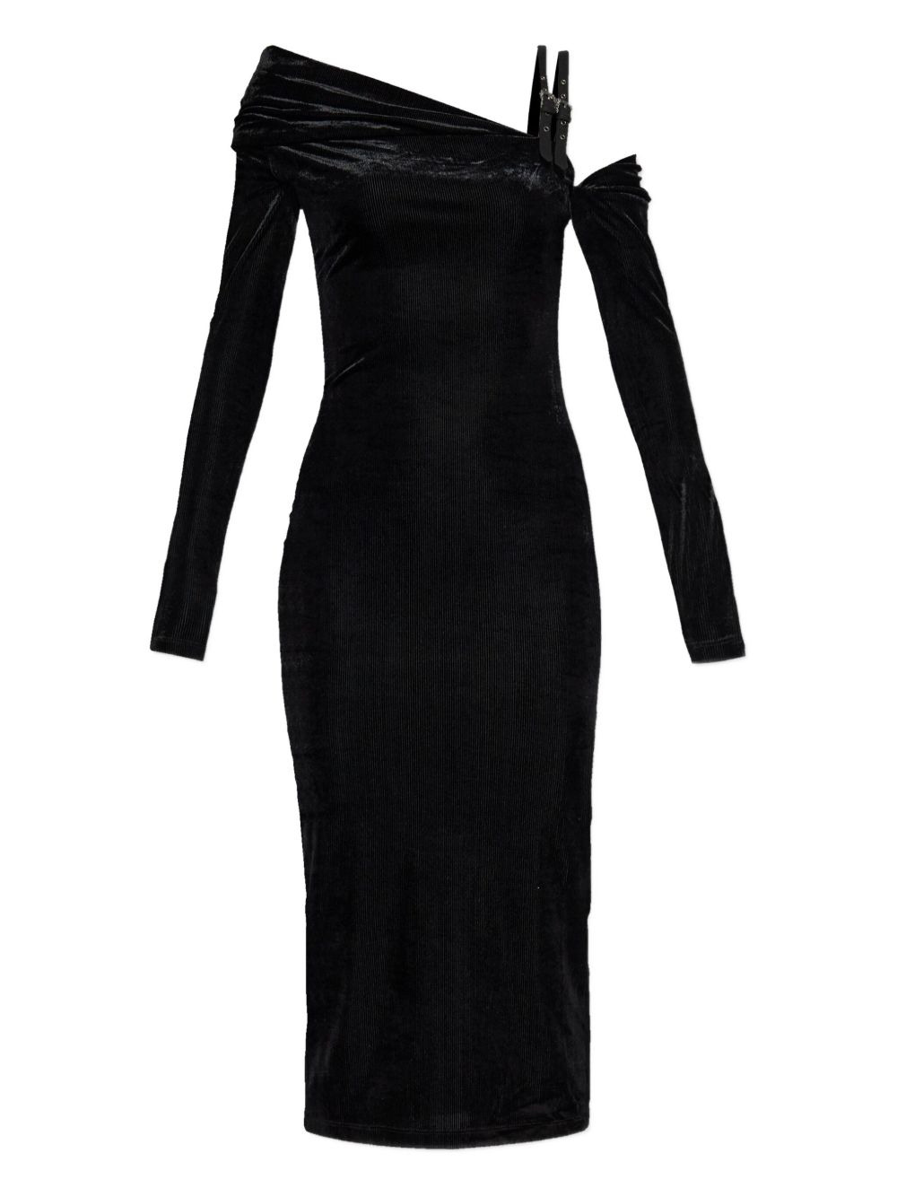 off-shoulder buckle midi dress Highlights - Black - Off-shoulder design - Long sleeves - Buckle detail - Midi length - Ribbed texture Made in Italy Composition Polyester 100% Washing instructions Read Manufacturer Guidelines