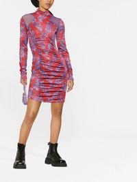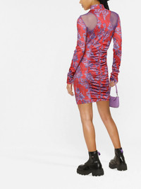 paisley-print ruched minidress Versace Jeans Couture's minidress is decorated with paisley motifs all over - a nod to the brand's penchant for ornate decoration. The purple motifs pop against the red background. Made in Italy Composition Outer: Polyester 100%, Polyamide 82%, Elastane 18% Lining: Polyamide 100% SIZE & FIT Model measurements Height 5 ft 10 in(1.78 m) Bust/Chest 30.31 in(77 cm) Hips 36.61 in(93 cm) Waist 24.8 in(63 cm) FittingInformation This piece fits true to size. We recommend you get your regular size Cut for a slim fit Made with a mid-weight fabric Washing instructions Machine Wash