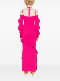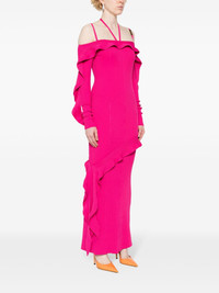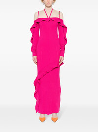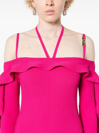 ribbed-knit long-sleeve dress Highlights - Hot pink - Ribbed knit - Ruffled trim - Spaghetti straps - Gold-tone logo lettering - Halterneck tie fastening - Off-shoulder - Long sleeves - Straight hem - Unlined Imported Composition Viscose 70%, Polyester 30% SIZE & FIT Model measurements Height 5 ft 9 in(1.75 m) Bust/Chest 34.64 in(88 cm) Hips 36.61 in(93 cm) Waist 26.37 in(67 cm) FittingInformation Designed for a close fit throughout Made with a midweight knit, this piece offers some stretch This piece fits true to size – take your usual size Washing instructions Hand Wash