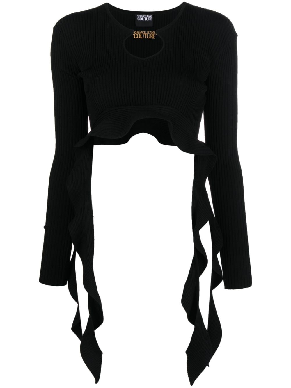ruffled ribbed-knit cropped top Highlights - Black - Ribbed knit - Cut-out detailing - Gold-tone logo plaque - Round neck - Long sleeves - Asymmetric ruffle hem - Cropped Imported Composition Viscose 70%, Polyester 30% SIZE & FIT Model measurements Height 5 ft 10 in(1.77 m) Bust/Chest 31.1 in(79 cm) Hips 34.64 in(88 cm) Waist 24.8 in(63 cm) FittingInformation Designed for a close fit throughout Cropped in length Made with a midweight knit, this piece offers some stretch This piece fits true to size – take your usual size Washing instructions Machine Wash