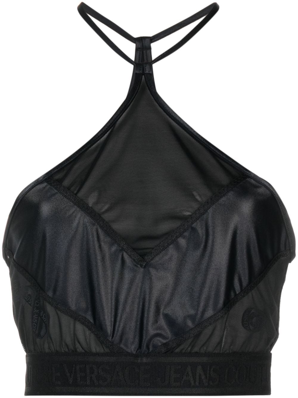 tulle-panelled crop top Versace Jeans Couture reinterprets sportswear codes with this black top. It’s spliced with angular panels of satin and tulle with slim straps that can be shifted to the side to convert the cut-away neckline and racerback to a one-shoulder silhouette. The elasticated logo-jacquard underband at the cropped hem ensures secure wear. Highlights - Black - Satin weave - Tulle panels - Semi-sheer panels - Panelled design - Jacquard logo motif - One-shoulder - Spaghetti straps - Logo underband - Racerback Made in Italy Composition Polyamide 79%, Elastane 21% SIZE & FIT Model measurements Height 5 ft 10 in(1.77 m) Bust/Chest 33.07 in(84 cm) Hips 37 in(94 cm) Waist 24.8 in(63 cm) FittingInformation Designed for a close fit throughout The elasticated waist allows for a comfortable fit Made from a midweight stretch fabric, this piece offers elasticity and flexibility when worn This piece fits large – take one size down Washing instructions Machine Wash