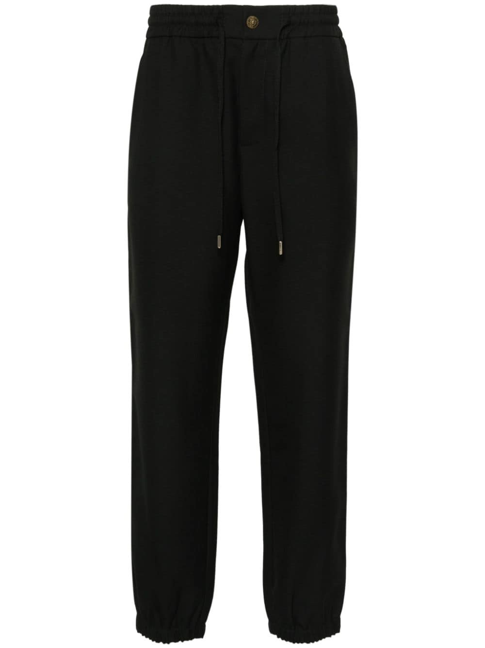 V-Emblem tapered trousers Highlights - Black - Twill weave - Elasticated drawstring waistband - Two side slash pockets - Full-length - Elasticated ankles - Rear zip-fastening pocket - V-emblem logo print to the rear - Tapered leg - Front concealed zip-fly and button fastening Made in Italy Composition Outer: Polyester 70%, Viscose 30% Lining: Cotton 100% SIZE & FIT Model measurements Height 6 ft 2 in(1.87 m) Bust/Chest 36.61 in(93 cm) Hips 35.03 in(89 cm) Waist 27.95 in(71 cm) FittingInformation Designed for a relaxed tapered leg, allowing a comfortable loose fit above the knee with a closer fit towards the calves The elasticated hem at the ankle allows for movement and a comfortable fit Made from a midweight non-stretch fabric This piece fits true to size – take your usual size