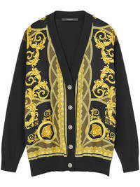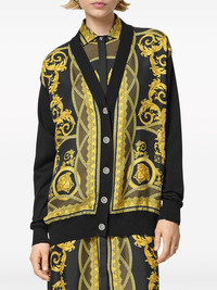 La Coupe des Dieux cardigan Highlights - Black/gold-tone - Signature barocco print - Knitted construction - V-neck - Front button fastening - Long sleeves - Ribbed-knit edge Made in Italy Composition Virgin Wool 70%, Silk 30%