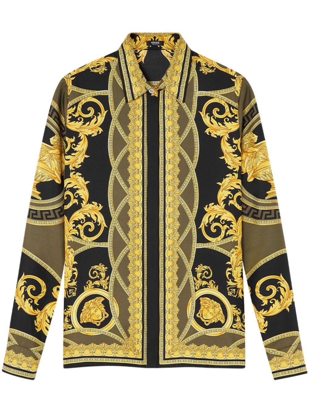 La Coupe des Dieux silk shirt Highlights - Yellow/multicolour - Silk - Twill weave - All-over graphic print - Medusa head motif - Pointed flat collar - Long sleeves - Concealed front button fastening - Buttoned cuffs - Straight hem Made in Italy Composition Silk 100%