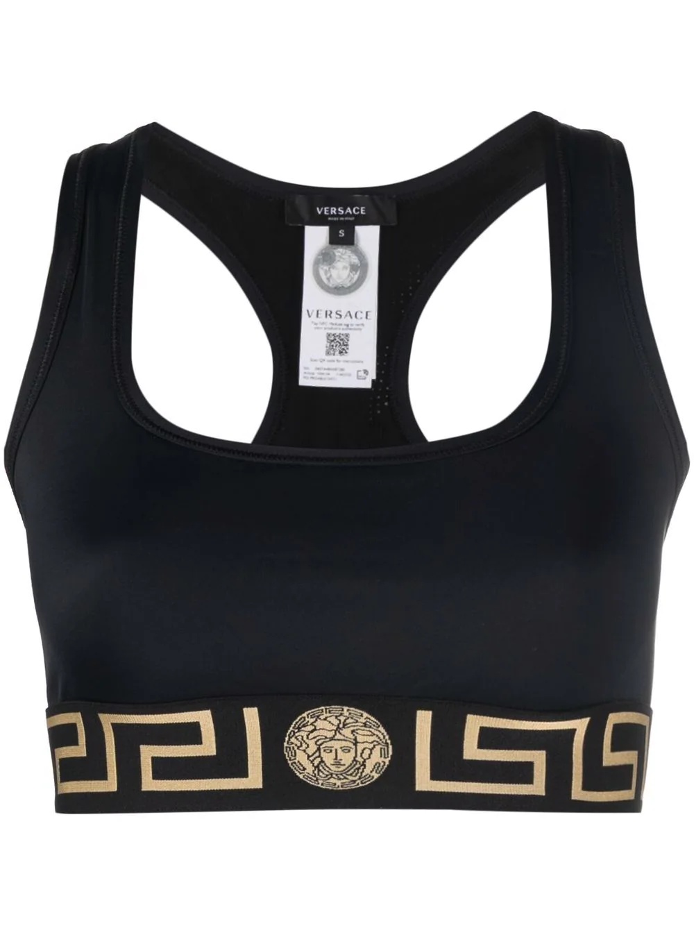 La Greca cropped sports bra Celebrating the house's Greek-inspired aesthetic, this sports bra is adorned with the label's new La Greca print and the Medusa Head detail at the underband. Made in Italy Composition Outer: Polyamide 78%, Spandex/Elastane 22% Lining: Polyamide 94%, Spandex/Elastane 6% SIZE & FIT Model measurements Height 5 ft 10 in(1.78 m) Bust/Chest 31.49 in(80 cm) Hips 36.22 in(92 cm) Waist 25.59 in(65 cm) FittingInformation This piece fits true to size. We recommend you get your regular size Cut for a close fit Made with a mid-weight stretch fabric Washing instructions Hand Wash