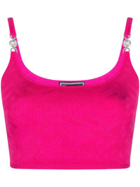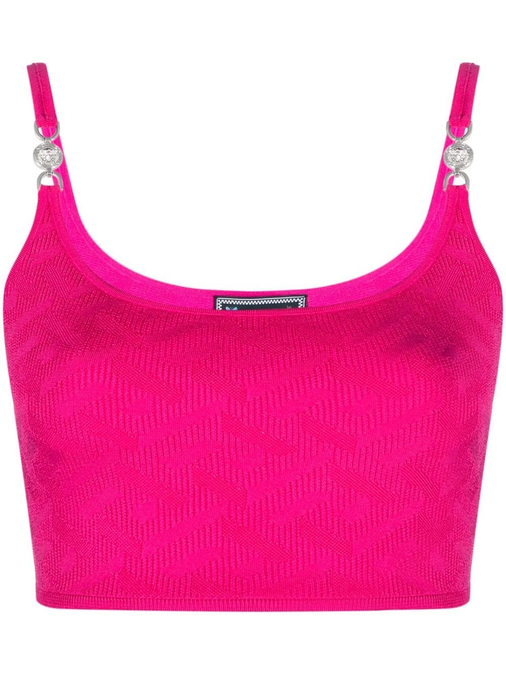 La Greca Medusa '95 knitted crop top Versace is known for its extravagant use of house motifs and bold colourways, as showcased by this crop top. Imagined in a fuchsia-pink hue, it's decorated with a signature Greca motif, woven into its fine knit construction, and detailed with Medusa '95 hardware to the straps. Highlights - Fuchsia pink - Fine knit - Signature greca detailing - Medusa plaque detail - Plunging u-neck - Thin shoulder straps - Cropped Made in Italy Composition Viscose 92%, Polyamide 6%, Elastane 2% SIZE & FIT Model measurements Height 5 ft 10 in(1.78 m) Bust/Chest 31.49 in(80 cm) Hips 35.03 in(89 cm) Waist 23.62 in(60 cm) FittingInformation Designed for a close fit throughout Made with a lightweight knit, this piece offers some stretch This piece fits true to size – take your usual size