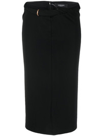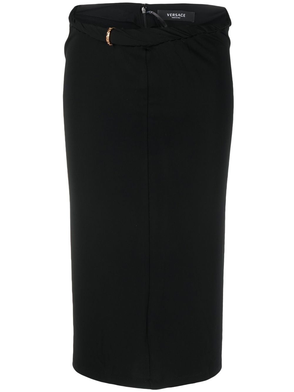 La Greca midi skirt This La Greca skirt displays Versace's ability to subtly elevate wardrobe staples. Cut from black stretch jersey, it's embellished with namesake gold-tone hardware at the twisted waistband. Highlights - Black - Stretch-design - Gathered detailing - Gold-tone hardware - Below-knee length Made in Italy Composition Outer: Viscose 95%, Spandex/Elastane 5% Lining: Acetate 75%, Silk 25% SIZE & FIT Model measurements Height 5 ft 10 in(1.77 m) Bust/Chest 32.67 in(83 cm) Hips 35.43 in(90 cm) Waist 23.62 in(60 cm) Measurement HIPS 30 in(76.2 cm) LENGTH 29.01 in(73.7 cm) WAIST 24.01 in(61 cm) Washing instructions Dry Clean Only