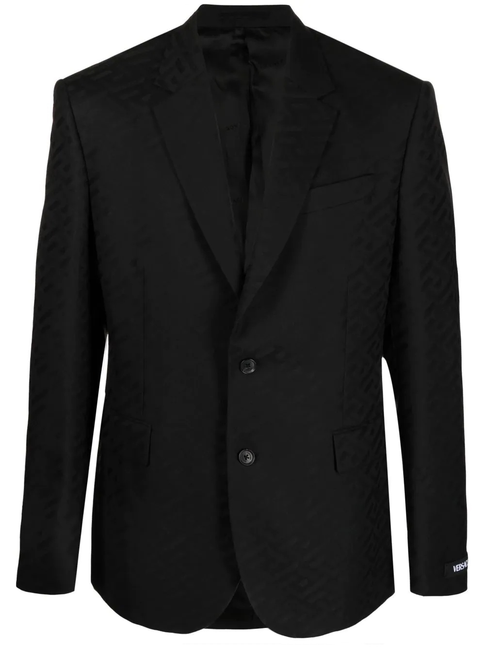 La Greca single-breasted wool blazer La Greca single-breasted wool blazer from VERSACE featuring black, virgin wool, signature La Greca print, notched lapels, front button fastening, two side flap pockets and long sleeves. Made in Italy Composition Lining: Cotton 100%, Cupro 100% Outer: Virgin Wool 100% SIZE & FIT Model measurements Height 6 ft 2 in(1.88 m) Bust/Chest 37.79 in(96 cm) Hips 38.58 in(98 cm) Waist 29.52 in(75 cm) FittingInformation This piece fits true to size. We recommend you get your regular size Cut for a slim fit Made with a mid-weight non-stretch fabric