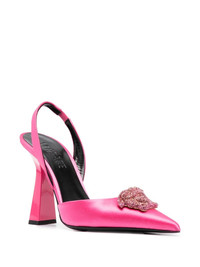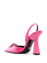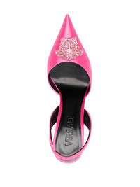 La Medusa 105mm slingback pumps A high-octane spirit informs Versace's AW23 collection, captured in the crystal-embellished Medusa head plaque that adorns these pink satin pumps. They're set on a towering sculpted heel that adds height and volume to the design and are finished with an elasticated slingback strap. Highlights - Pink - Calf leather - Satin finish - Medusa plaque detail - Crystal embellishment - Pointed toe - Elasticated slingback strap - Branded footbed - Leather sole - High sculpted heel Made in Italy Composition Outer: Calf Leather 100%, Fabric 100% Sole: Calf Leather 100% Lining: Calf Leather 100% SIZE & FIT Measurement HEEL 4.52 in(11.5 cm)