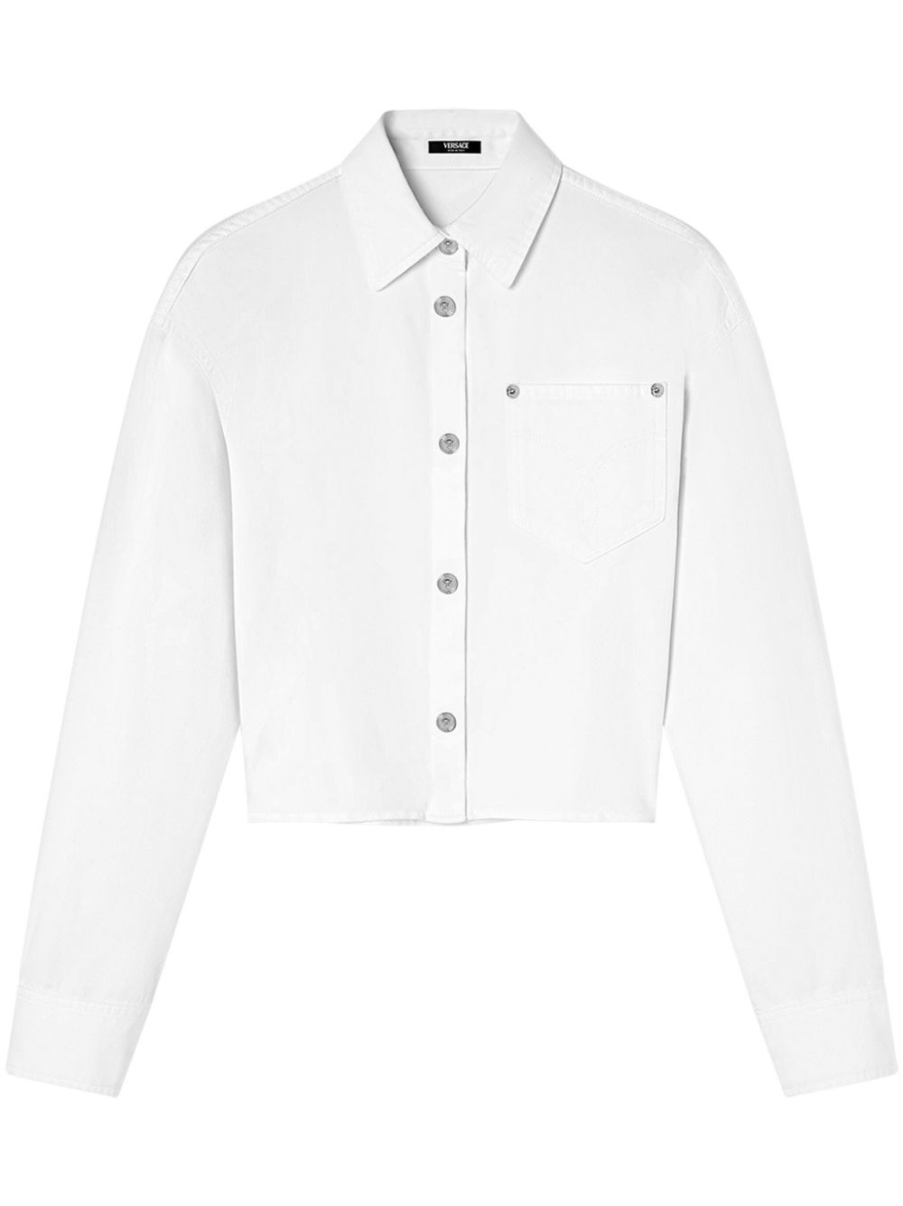 cropped denim shirt Highlights - White - Denim - Front press-stud fastening - Pointed flat collar - Long sleeves - Chest patch pocket - Rivet detailing - Medusa plaque detail - Press-stud fastening cuffs - Straight hem - Cropped Made in Italy Composition Cotton 100%