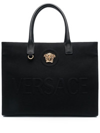 large La Medusa tote bag Lined in canvas for a casual appeal, this Versace tote is emblazoned with the brand's lettering embossed on the front. To complement it, the iconic Medusa Head plaque stands proudly in the centre. Highlights - La medusa canvas tote bag from versace featuring black, canvas, medusa plaque detail, embossed logo to the front, two rolled top handles, press-stud fastening, main compartment and internal zip-fastening pocket. Made in Italy Composition Outer: Fabric 100% SIZE & FIT Model measurements Height 5 ft 11 in(1.8 m) Bust/Chest 32.67 in(83 cm) Hips 36.22 in(92 cm) Waist 24.4 in(62 cm) Measurement DEPTH 6.29 in(16 cm) HANDLE 6.29 in(16 cm) HEIGHT 11.81 in(30 cm) WIDTH 15.74 in(40 cm)