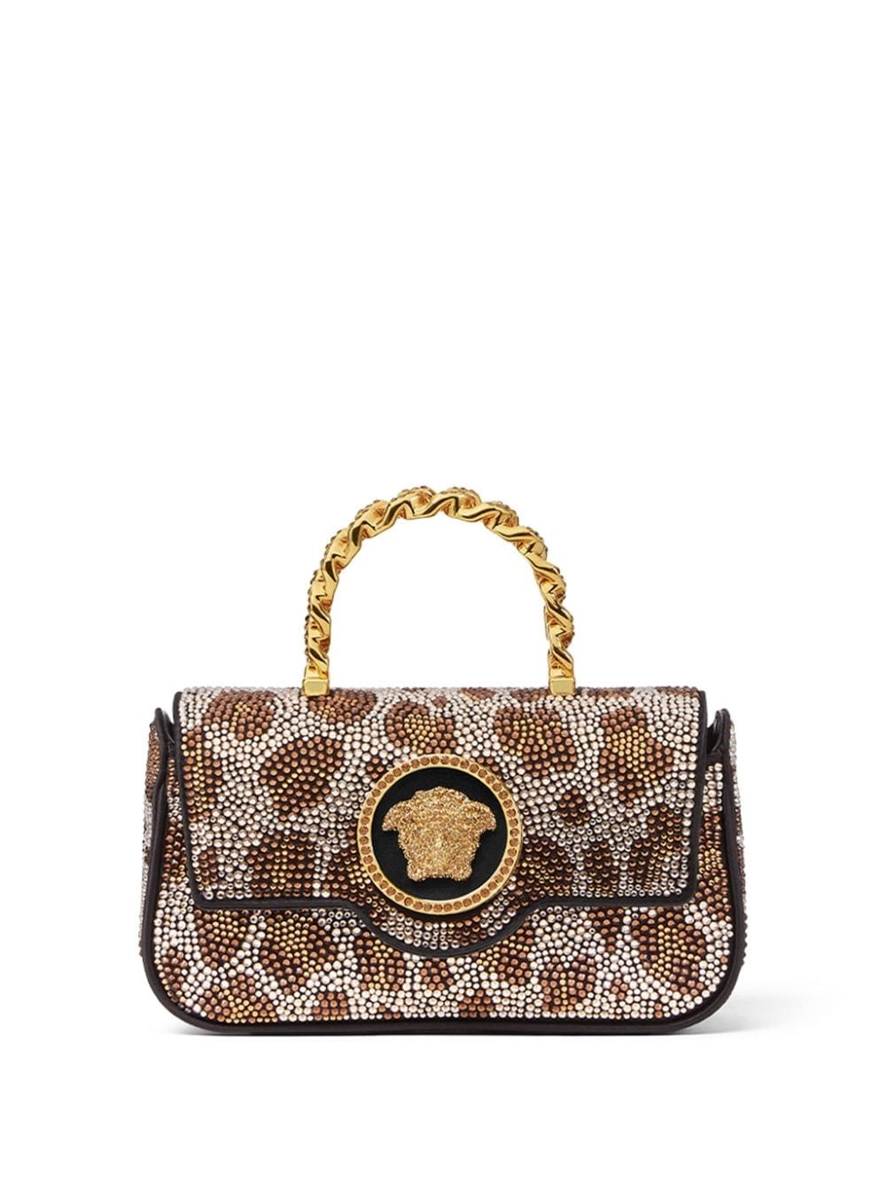 La Medusa crystal-leopard mini bag Highlights - Cedar brown/silver-tone - Medusa head motif - Foldover top with magnetic fastening - Crystal embellishment - All-over leopard print - Single top handle - Chain-link shoulder strap - Main compartment Made in Italy Composition Outer: Viscose 72%, Silk 28% Lining: Lambskin 100%