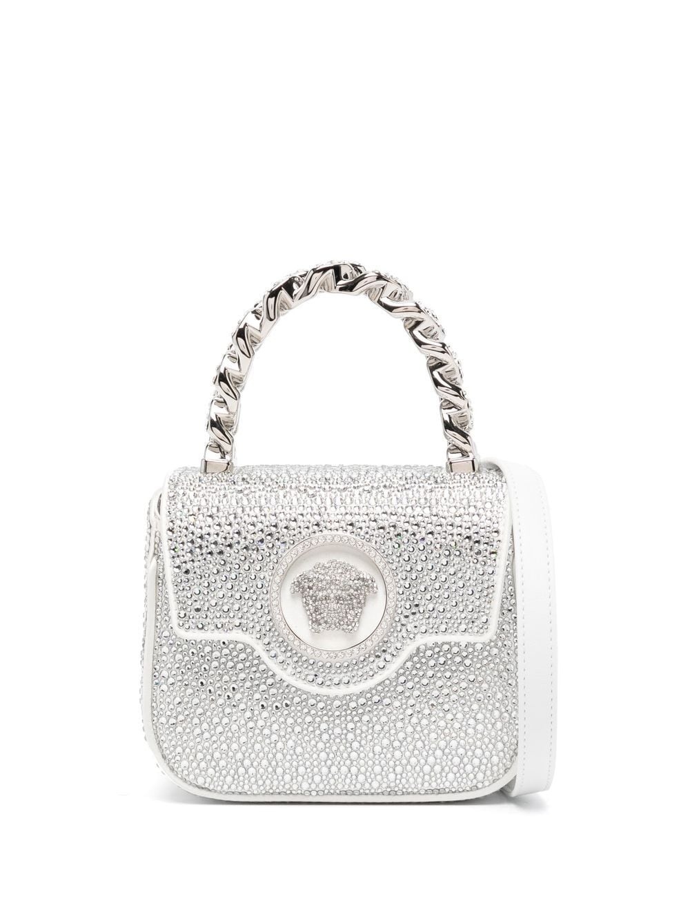 La Medusa crystal-embellished mini bag Versace's La Medusa mini bag aligns with the brand's maximalist aesthetic. Showcasing an all-black satin finish, it's embellished with sparkling crystals and topped with the iconic Medusa Head motif. Highlights - Silver-tone - Satin finish - Crystal embellishment - Medusa head motif - Single chain-link top handle - Adjustable detachable shoulder strap - Foldover top with press-stud fastening - Internal card slots - Internal logo stamp - Silver-tone hardware Made in Italy Composition Leather 50%, Crystal 50% SIZE & FIT Model measurements Height 5 ft 10 in(1.77 m) Bust/Chest 30.31 in(77 cm) Hips 34.25 in(87 cm) Waist 24.4 in(62 cm) Measurement DEPTH 2.36 in(6 cm) HANDLE 3.14 in(8 cm) HEIGHT 5.11 in(13 cm) STRAP 13.77 in(35 cm) WIDTH 6.29 in(16 cm)