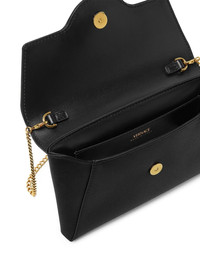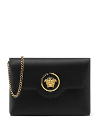 La Medusa envelope clutch bag Highlights - Black - Satin finish - Medusa plaque detail - Detachable chain-link shoulder strap - Foldover top with magnetic fastening - Main compartment - Internal slip pocket - Leather lining - Gold-tone hardware Made in Italy Composition Outer: Viscose 72%, Silk 28% Lining: Lambskin 100%