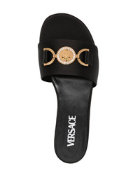 Medusa '95 satin flat sandals Versace's iconic Medusa head, inspired by Greek mythology, is the focal point of these slides. Crafted in calf leather to a satin finish, they are further adorned with crystal embellishments. Highlights - Black - Calf leather - Satin finish - Medusa head motif - Gold-tone hardware - Crystal embellishment - Branded leather insole - Flat sole Made in Italy Composition Outer: Calf Leather 100% Lining: Calf Leather 100% Sole: Calf Leather 100% SIZE & FIT Measurement HEEL 0.78 in(2 cm) Sole height 0.39 in(1 cm)