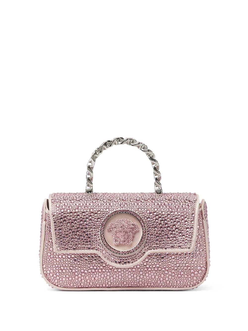 La Medusa crystal mini bag Highlights - Light pink - Leather trim - Foldover top with magnetic fastening - Single metallic top handle - Detachable chain-link shoulder strap - Rhinestone embellishment - Medusa plaque detail - Main compartment Made in Italy Composition Silk 100% SIZE & FIT Measurement STRAP 20.47 in(52 cm) DEPTH 1.96 in(5 cm) HANDLE 1.96 in(5 cm) WIDTH 7.48 in(19 cm) HEIGHT 4.72 in(12 cm)