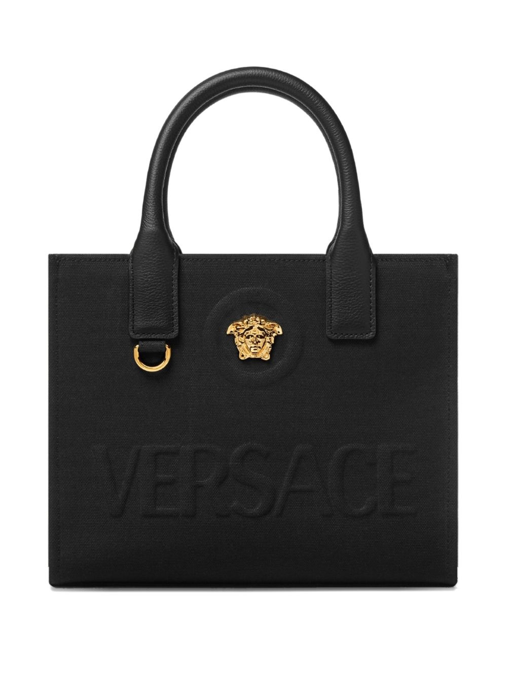 La Medusa mini tote bag Highlights - Black - Embossed logo - Top handles - Gold-tone hardware - Internal zip pocket Made in Italy Composition Outer: Cotton 100%, Calf Leather 100% Lining: Cotton 100% SIZE & FIT Measurement DEPTH 5.31 in(13.5 cm) HANDLE 4.13 in(10.5 cm) HEIGHT 7.87 in(20 cm) WIDTH 9.64 in(24.5 cm)