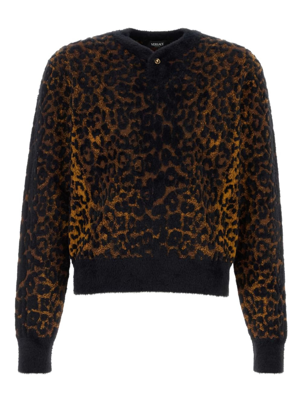 leopard-jacquard sweater Highlights - Gold and black - Leopard pattern - Jacquard - Ribbed cuffs - Round neck - Button fastening Imported Composition Fabric 100% Washing instructions Read Manufacturer Guidelines