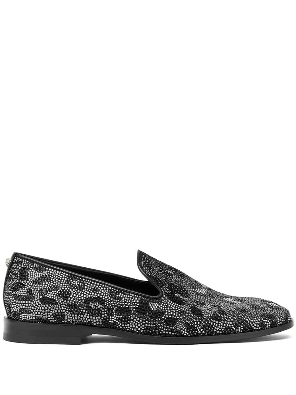 leopard-print loafers Highlights - Black/ash grey - Leather - Leopard print - Crystal embellishment - Almond toe - Slip-on style - Branded insole - Leather sole Made in Italy Composition Outer: Polyester 65%, Polyurethane 35% Sole: Calf Leather 100% Lining: Calf Leather 100%, Goat Skin 100%