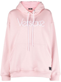 1978 Re-Edition logo-embroidered hoodie The embroidered logo at the front of this pink cotton Versace hoodie is actually the very first version of the brand’s moniker that debuted in the ‘80s. Highlights - Rose pink - Cotton - Jersey texture - Embroidered logo to the front - Drawstring hood - Drop shoulder - Long sleeves - Front pouch pocket - Ribbed cuffs and hem - Straight hem - French terry lining Made in Italy Composition Outer: Cotton 100%, Polyester 99% Lining: Cotton 100% SIZE & FIT Model measurements Height 5 ft 10 in(1.78 m) Bust/Chest 33.07 in(84 cm) Hips 36.61 in(93 cm) Waist 24.8 in(63 cm) FittingInformation Designed for a relaxed fit, this piece allows for comfort and movement when worn Made from a midweight non-stretch fabric, this piece offers minimal elasticity when worn This piece fits true to size – take your usual size Washing instructions Machine Wash