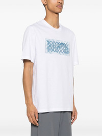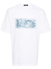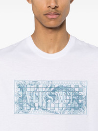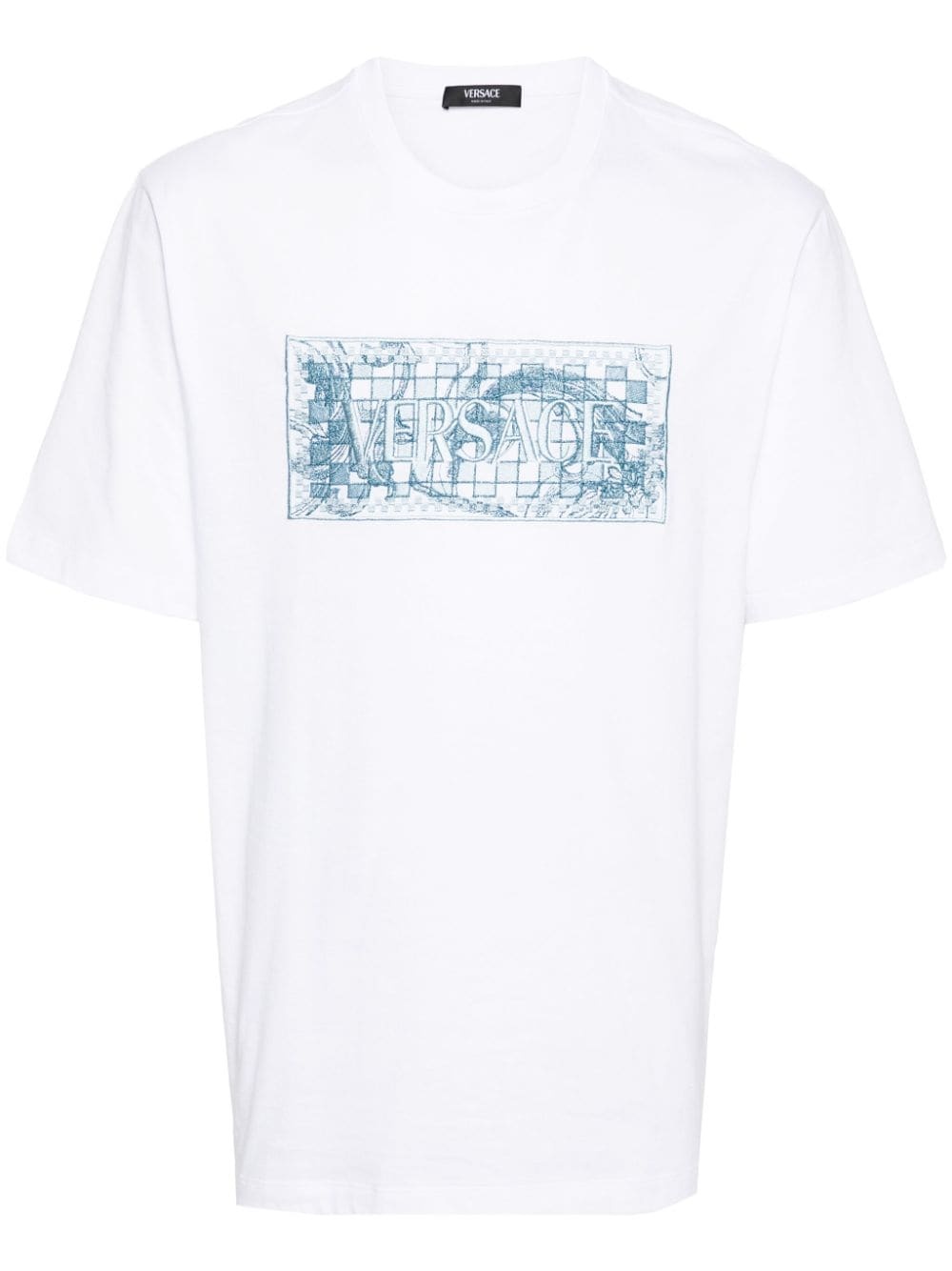 logo-embroidered cotton T-shirt The Medusa logo is a synonym for Versace, with the iconic motif being reinvented every season. Crafted from white cotton, this T-shirt is decorated with a blue embroidered iteration of the Medusa Contrasto motif. Highlights - Optical white - Cotton - Jersey texture - Embroidered design and logo to the front - Crew neck - Short sleeves - Straight hem Made in Italy Composition Cotton 100%, Viscose 62%, Polyamide 24%, Polyester 14% SIZE & FIT Model measurements Height 6 ft 2 in(1.87 m) Bust/Chest 38.18 in(97 cm) Hips 36.61 in(93 cm) Waist 29.13 in(74 cm) FittingInformation Designed for a regular fit allowing for a comfortably loose fit throughout the body Made from a midweight non-stretch fabric, this piece offers minimal elasticity when worn This piece fits true to size – take your usual size Washing instructions Machine Wash
