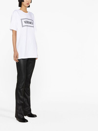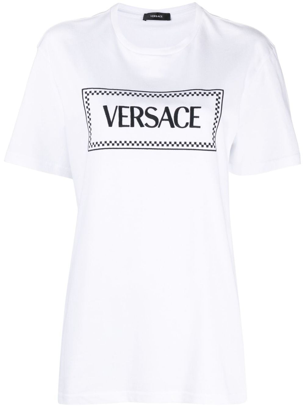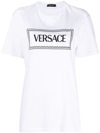 '90s Vintage logo-embroidered T-shirt A bold logo design is embroidered on the front of this Versace T-shirt in contrasting black thread, lending this basic T-shirt a statement-making look. Highlights - White - Cotton - Embroidered logo to the front - Crew neck - Short sleeves - Straight hem Imported Composition Polyester 100%, Cotton 100% SIZE & FIT Model measurements Height 5 ft 10 in(1.78 m) Bust/Chest 29.92 in(76 cm) Hips 34.64 in(88 cm) Waist 23.62 in(60 cm) FittingInformation Designed to be unstructured, offering a loose fit throughout Made from a midweight non-stretch fabric, this piece offers minimal elasticity when worn This piece fits true to size – take your usual size