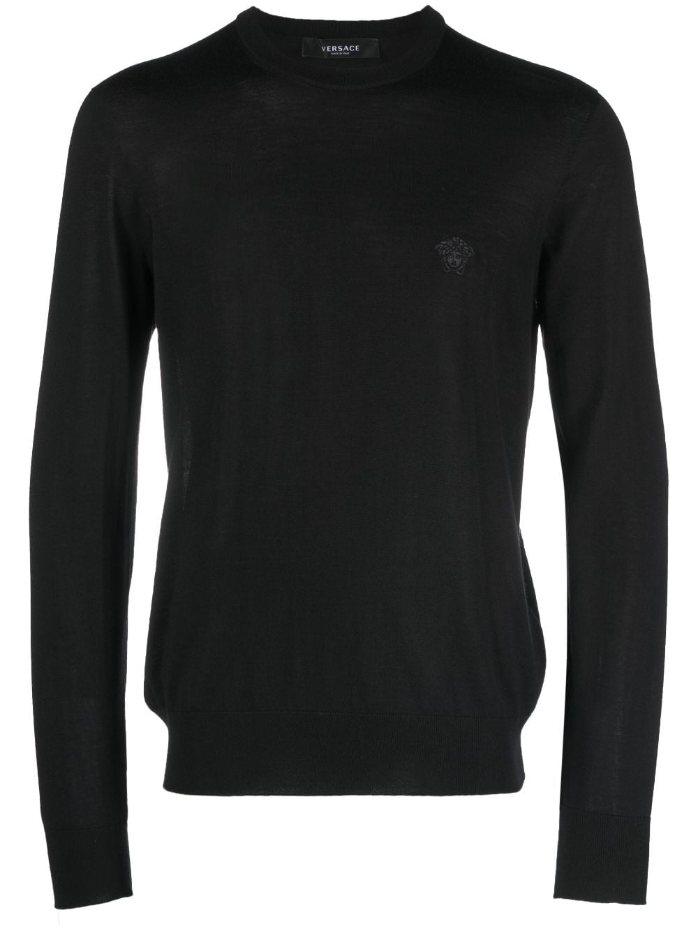 embroidered wool-blend jumper Versace's Medusa Head was first designed in 1993 and has since become an iconic motif for the brand. Here, it sits atop this luxurious wool-silk blend sweatshirt as embroidery on the chest. Highlights - Black - Wool-silk blend - Fine knit - Crew neck - Embroidered logo at the chest - Medusa head motif - Long sleeves - Straight hem Made in Italy Composition Viscose 100%, Wool 60%, Silk 30%, Cashmere 10% SIZE & FIT Model measurements Height 6 ft 2 in(1.87 m) Bust/Chest 35.82 in(91 cm) Hips 35.43 in(90 cm) Waist 27.95 in(71 cm) FittingInformation Designed for a relaxed fit, this piece allows for comfort and movement when worn Made with a lightweight knit, this piece offers some stretch This piece fits true to size – take your usual size Washing instructions Dry Clean Only