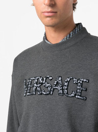 logo-patch cotton sweatshirt Made from cotton, this Versace sweatshirt is decorated at the front with the brand's logo in the Coccodrillo print. Cut to a relaxed silhouette, it has a soft brushed fleece lining. Highlights - Grey - Cotton - Logo patch to the front - Crew neck - Long sleeves - Straight hem Made in Italy Composition Cotton 100%, Polyester 100% SIZE & FIT Model measurements Height 6 ft 1 in(1.85 m) Bust/Chest 35.43 in(90 cm) Hips 35.82 in(91 cm) Waist 27.55 in(70 cm) FittingInformation Designed for a relaxed fit, this piece allows for comfort and movement when worn Made from a midweight non-stretch fabric, this piece offers minimal elasticity when worn This piece fits true to size – take your usual size Washing instructions Machine Wash