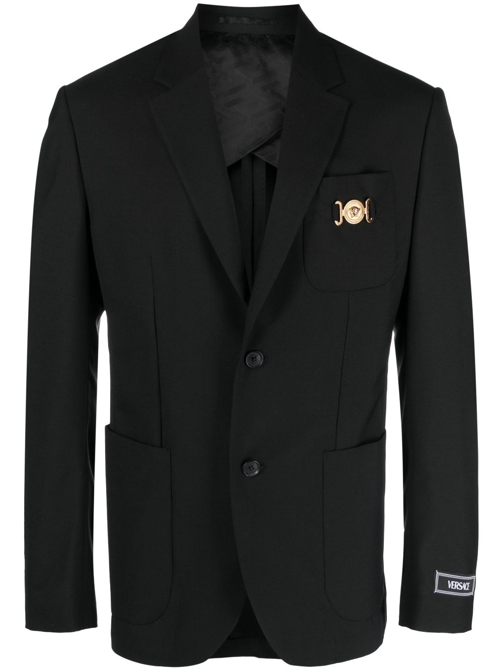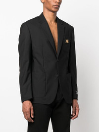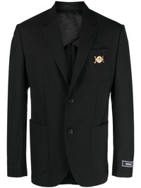 Medusa Biggie single-breasted blazer Highlights - Black - Virgin wool/cotton - Medusa head motif - Gold-tone logo plaque - Logo patch at the sleeve - Notched lapels - Front button fastening - Long sleeves - Buttoned cuffs - Chest patch pocket - Two front patch pockets - Curved hem Made in Italy Composition Lining: Cupro 100%, Cotton 100% Outer: Virgin Wool 100% SIZE & FIT Model measurements Height 6 ft 2 in(1.87 m) Bust/Chest 36.22 in(92 cm) Hips 37 in(94 cm) Waist 27.95 in(71 cm) FittingInformation Designed for a slim fit, offering a comfortable fit that sits just away from the body The vented hem offers movement at the rear Made from a midweight non-stretch fabric This piece fits true to size – take your usual size Measurement CHEST 40.98 in(104.1 cm) SLEEVE LENGTH 25 in(63.5 cm) Shoulder Width 16.49 in(41.9 cm) LENGTH 27.99 in(71.1 cm) WAIST 37.99 in(96.5 cm)