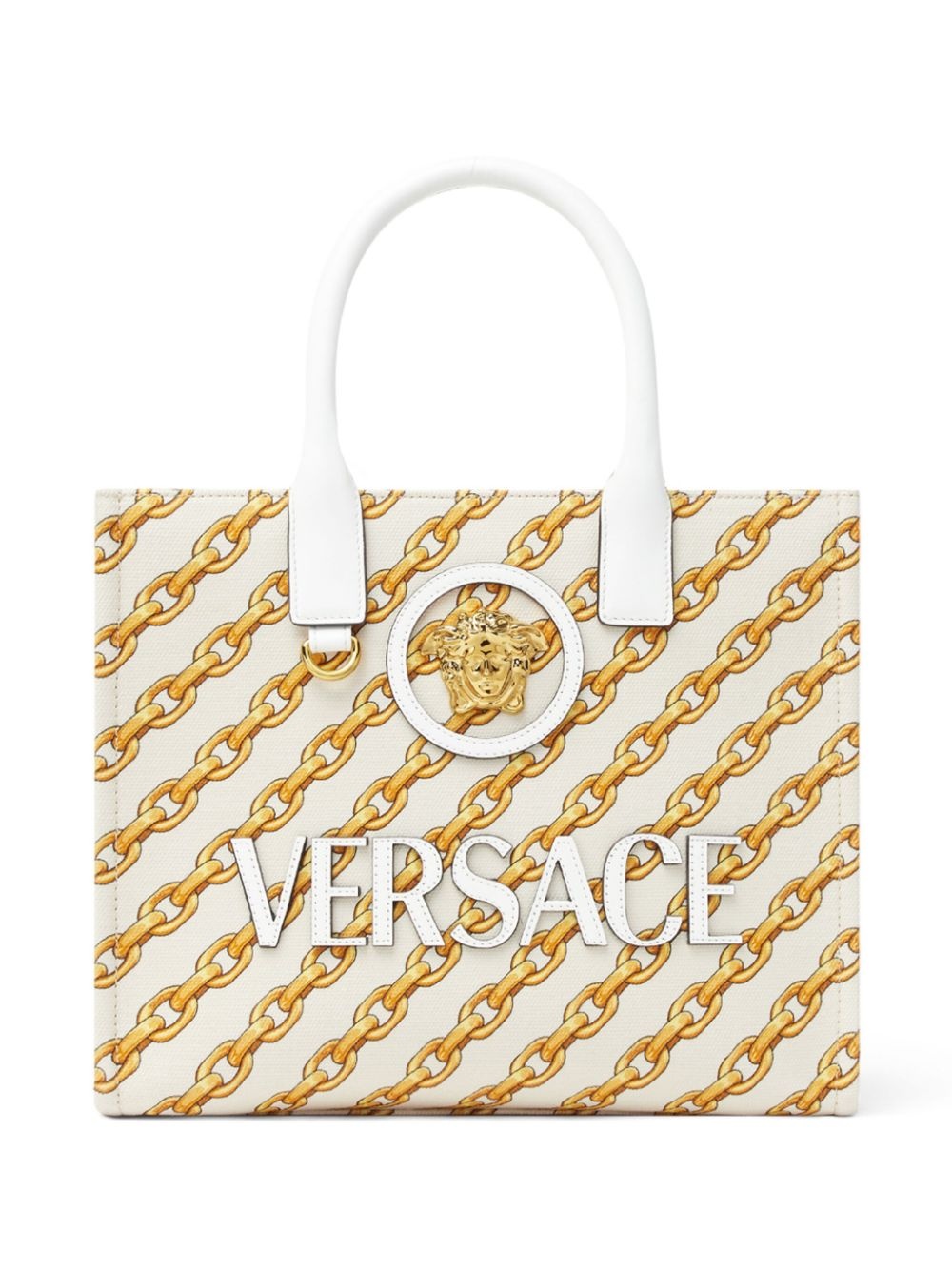 small Chain Stripes La Medusa tote bag Highlights - Yellow/white - Cotton/calf leather - Logo print to the front - Press-stud fastening - Two top handles - Adjustable detachable shoulder strap - All-over graphic print - Main compartment - Internal zip-fastening pocket Made in Italy Composition Outer: Cotton 100%, Calf Leather 100% Lining: Cotton 100% SIZE & FIT Measurement DEPTH 5.7 in(14.5 cm) HANDLE 5.11 in(13 cm) HEIGHT 9.44 in(24 cm) WIDTH 11.61 in(29.5 cm)
