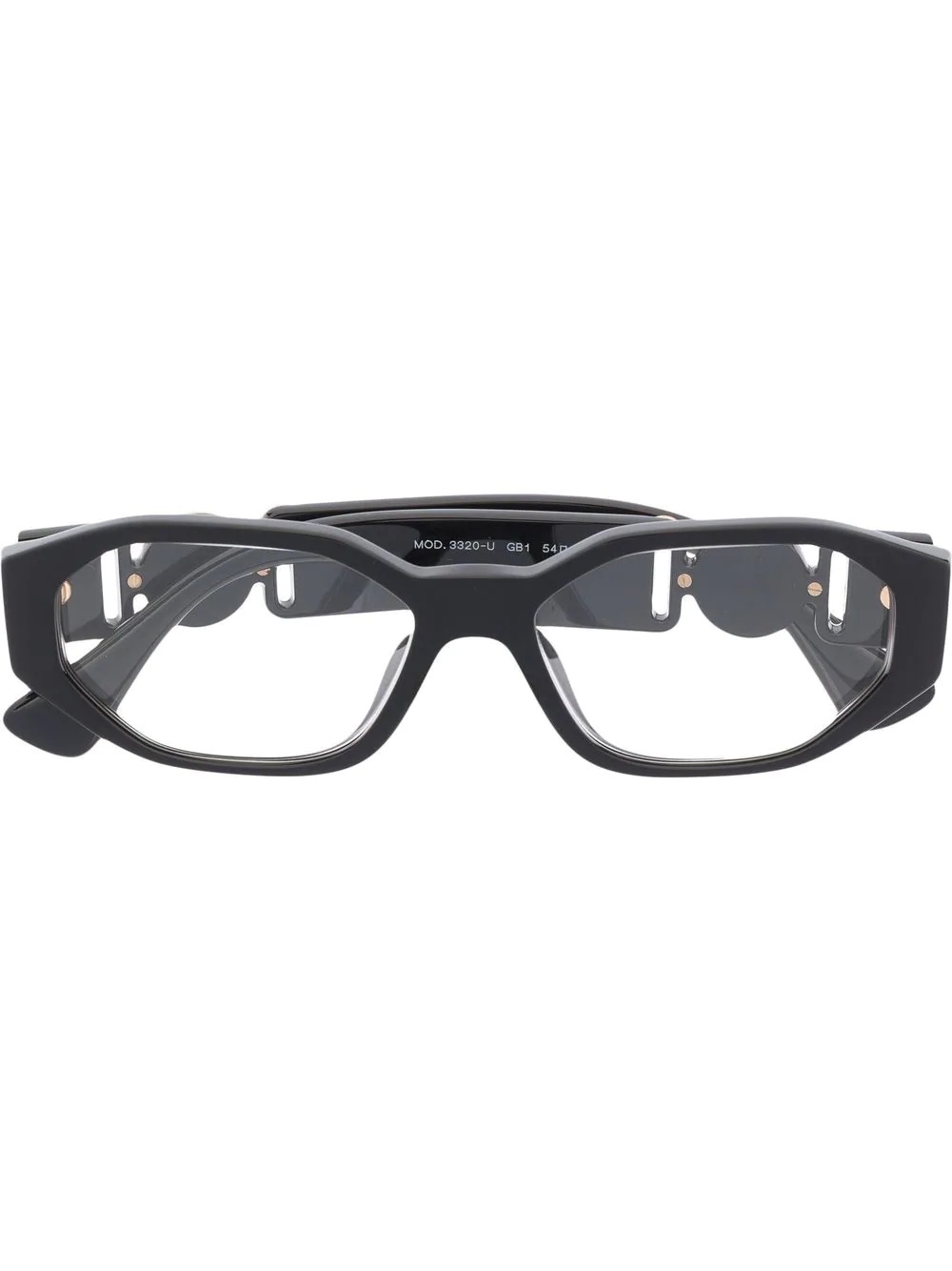logo square-frame glasses logo square-frame glasses from VERSACE EYEWEAR featuring black, logo plaque at the arm, gold-tone hardware, square frame and clear lenses. These glasses come with a protective case.. Made in Italy Composition Acetate 100% SIZE & FIT Measurement Arm Length 5.7 in(14.5 cm) Bridge Width 0.62 in(1.6 cm) Lens Diameter 2.12 in(5.4 cm) Total Width 5.62 in(14.3 cm)