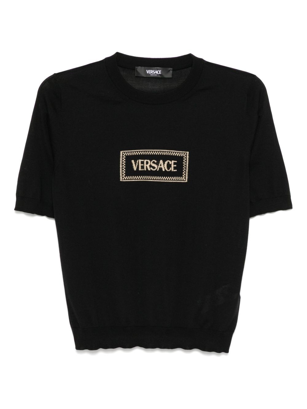 logo top Highlights - Black - Crew nec - Short sleeves - Ribbed cuffs and hem Made in Italy Composition Wool 92%, Viscose 6%, Polyester 2% SIZE & FIT Model measurements Height 5 ft 9 in(1.76 m) Bust/Chest 31.1 in(79 cm) Hips 35.03 in(89 cm) Waist 24.4 in(62 cm) FittingInformation Designed for a slim fit that sits just away from the body offering a close yet comfortable fit Made with a lightweight knit, this piece offers some stretch
