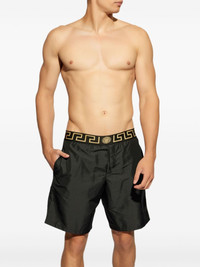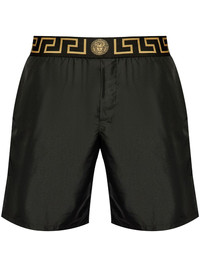 Greca Border swim shorts Highlights - Black - Textured finish - Logo waistband - Two side welt pockets - Partial lining - Thigh-length - Elasticated waistband - This piece comes complete with a protective dust bag. - Be mindful to try on swimwear over your own garments. Made in Italy Composition Outer: Polyester 100% Lining: Polyester 93%, Elastane 7%