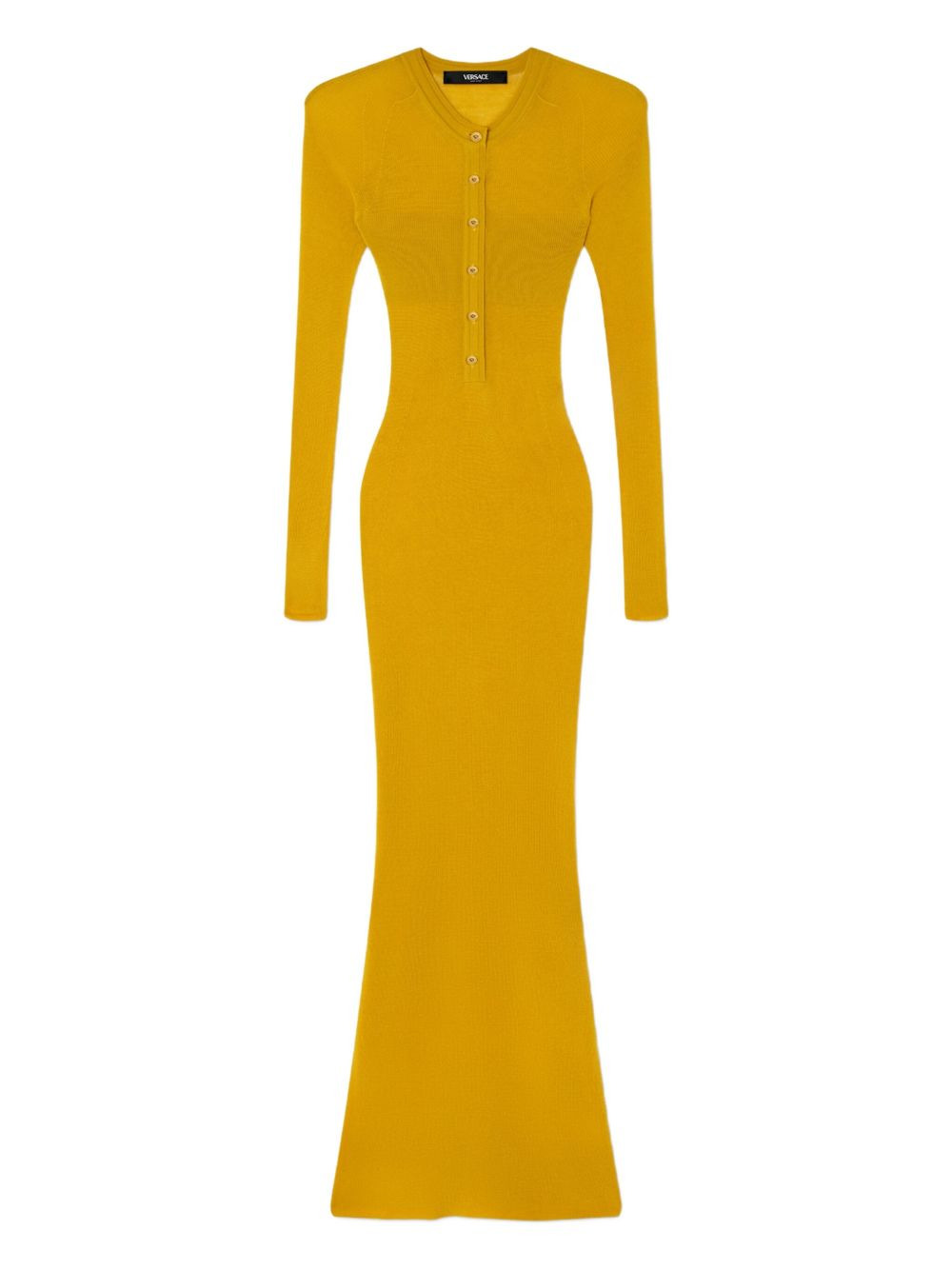 long-sleeve ribbed-knit dress Highlights - Yellow - Ribbed knit - Long sleeves - Button placket - Close-fitting - Maxi length Imported Composition Fabric 100% Washing instructions Read Manufacturer Guidelines