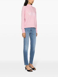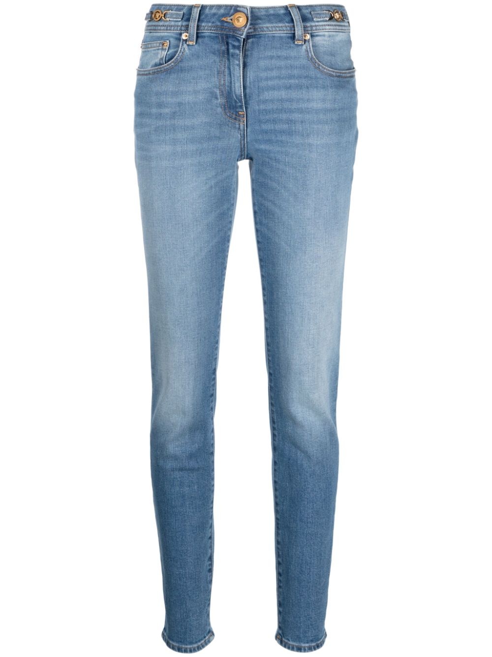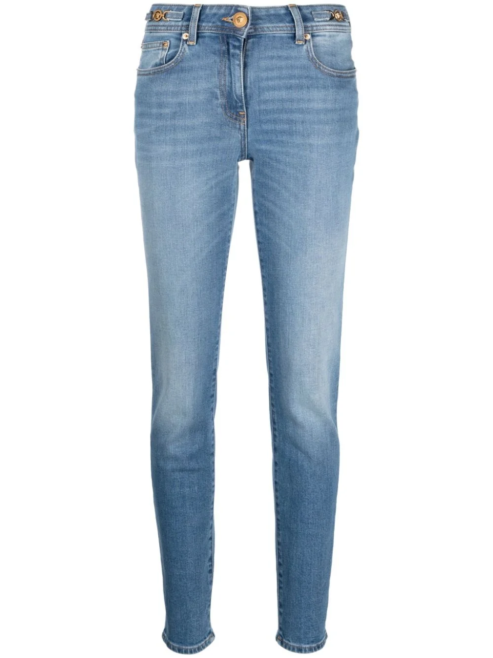 low-rise Medusa Head-motif skinny jeans Versace's Medusa Head is an archival emblem that reflects the brand's enduring heritage; it's reimagined as gold-tone metal hardware, decorating these jeans. The opulent embellishments are complemented by the 'V' logo belt loops for a more subtle take on branding. Highlights - Indigo blue - Stretch-cotton - Denim - Low-rise - Skinny cut - Tapered leg - Whiskering effect at the thighs - Medusa head motif - Logo patch to the rear - Contrast stitching - Belt loops - Front button and zip fastening - Classic five pockets - Straight hem - Gold-tone hardware Made in Italy Composition Lining: Polyester 65%, Cotton 35% Outer: Calf Leather 100%, Cotton 98%, Spandex/Elastane 2% SIZE & FIT Model measurements Height 5 ft 10 in(1.78 m) Bust/Chest 31.49 in(80 cm) Hips 35.03 in(89 cm) Waist 23.62 in(60 cm) FittingInformation Designed for a skinny fit, these jeans offer a close fit throughout Constructed from stretch denim, this piece offers a stretch fit with durability This piece fits true to size – take your usual size Washing instructions Machine Wash