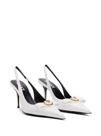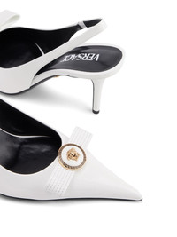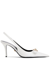 Medusa '95 85mm leather pumps These slingback pumps reveal Versace's penchant for bold silhouettes. They're crafted from glossy white patent leather and adorned with a gold-tone Medusa '95 plaque at the front. Highlights - Optical white - Goatskin - Patent finish - Bow detailing - Medusa head motif - Elasticated slingback strap - Pointed toe - Branded leather insole - High stiletto heel Made in Italy Composition Lining: Goat Skin 100%, Lamb Skin 100%, Calf Leather 100% Outer: Lamb Skin 100%, Calf Leather 100% SIZE & FIT Measurement HEEL 4.72 in(12 cm)