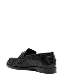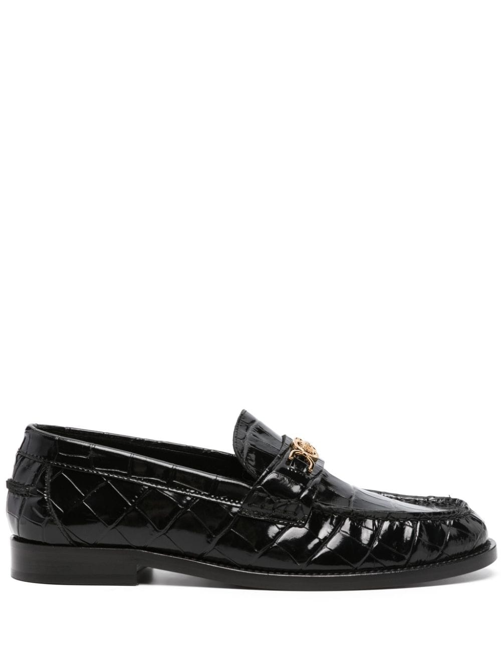 Medusa '95 crocodile-embossed loafers Boasting a sleek round-toed silhouette, these black Versace loafers are infused with the maison's powerful, high-octane aesthetic thanks to a glossy patent leather construction, embossed crocodile effect and the Medusa '95 hardware at the penny strap, an archival house code debuting in the mid-'90s that gives the design its name. Highlights - Black - Calf leather - Patent finish - Embossed crocodile effect - Medusa plaque detail - Strap detailing - Round toe - Slip-on style - Block heel - Branded leather insole - Leather outsole Made in Italy Composition Outer: Calf Leather 100% Lining: Calf Leather 100% Sole: Calf Leather 100% SIZE & FIT Measurement HEEL 0.78 in(2 cm)