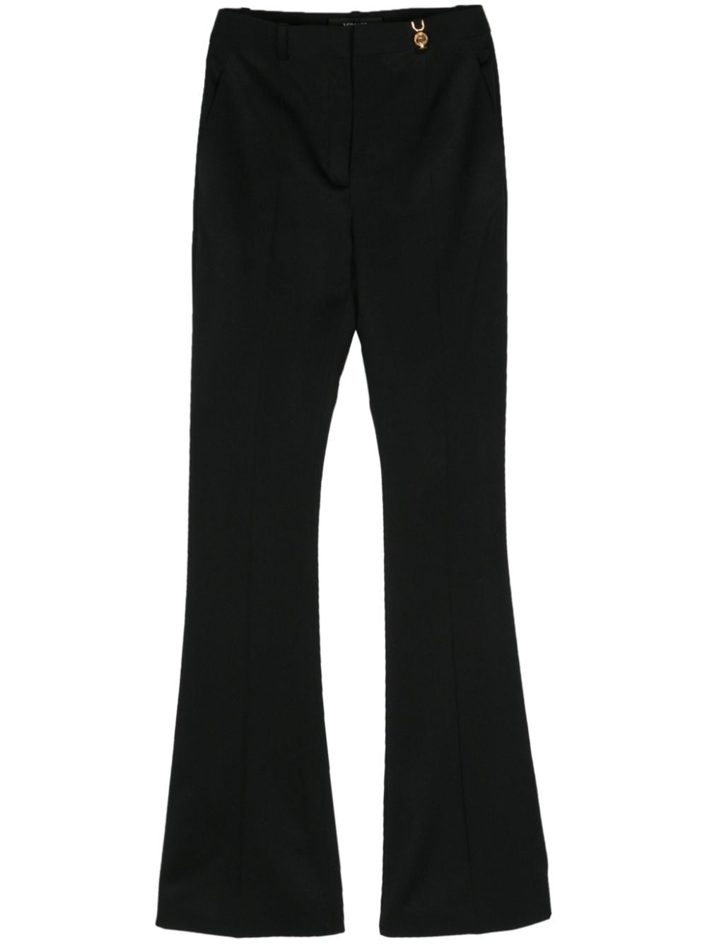 Medusa '95 flared trousers Highlights - Black - Virgin wool blend - Twill weave - Pressed crease - Dart detailing - Medusa plaque detail at the waist - Signature medusa head buttons - Low-rise - Flared leg - Two diagonal pockets to the sides - Two rear button-fastening jetted pockets - Belt loops - Concealed front button, hook and zip fastening - Unlined Made in Italy Composition Outer: Virgin Wool 98%, Elastane 2% Lining: Cupro 58%, Viscose 42%