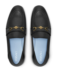 Medusa '95 leather slippers Highlights - Black - Calf leather - Brushed finish - Tonal stitching - Gold-tone hardware - Medusa head motif - Chain-link detailing - Round toe - Branded leather insole - Low stacked heel - Leather sole - Slip-on style Made in Italy Composition Lining: Calf Leather 100% Outer: Calf Leather 100% Sole: Calf Leather 100%