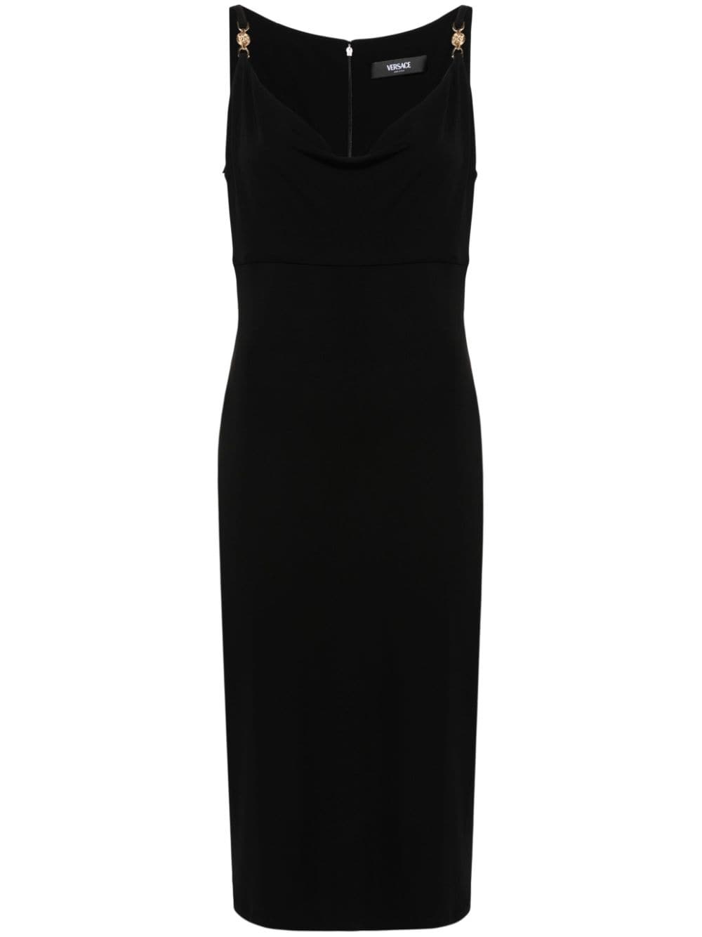 Medusa '95 midi dress Decorated with Versace's iconic Medusa '95 plaques on the shoulder straps, this midi dress cuts a sharp, sculpted silhouette through its reinforced bodice and elegant cowl neckline. Highlights - Black - Stretch-jersey - Cowl neck - Thin straps - Logo-engraved gold-tone hardware - Medusa head motif - Sleeveless - Below-knee length - Full lining - Straight hem - Concealed rear zip fastening Made in Italy Composition Outer: Viscose 95%, Spandex/Elastane 5% Lining: Viscose 95%, Spandex/Elastane 5% SIZE & FIT Model measurements Height 5 ft 11 in(1.8 m) Bust/Chest 31.49 in(80 cm) Hips 36.61 in(93 cm) Waist 24.4 in(62 cm) FittingInformation Designed for a slim fit that sits just away from the body offering a close yet comfortable fit Made from a midweight stretch fabric, this piece offers elasticity and flexibility when worn This piece fits true to size – take your usual size