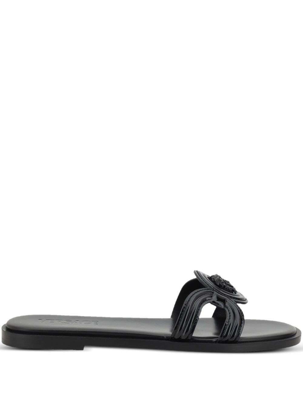 Medusa '95 slides Highlights - Black - Flat leather sole - Branded footbed - Cut-out detailing Imported Composition Sole: Calf Leather 100% Lining: Lamb Skin 100%, Goat Skin 100% Outer: Patent Calf Leather 100%
