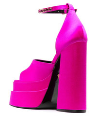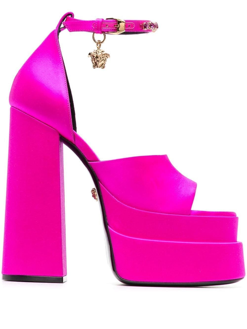 Medusa Aevitas Platform sandals fuchsia pink calf leather satin finish Medusa Head motif crystal embellishment gold-tone hardware open toe buckle-fastening ankle strap branded leather insole platform sole 155mm high block heel Made in Italy Composition Lining: Calf Leather 100% Outer: Fabric 100% Sole: Calf Leather 100% SIZE & FIT Measurement HEEL 6.1 in(15.5 cm) Sole height 2.55 in(6.5 cm)