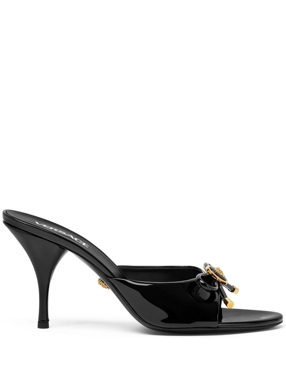85mm Opera Bow mules Highlights - Black - Calf leather - Patent finish - Medusa head motif - Bow detailing - Slip-on style - Round open toe - Branded leather insole - Leather sole Made in Italy Composition Lining: Calf Leather 100% Outer: Patent Calf Leather 100% Sole: Calf Leather 100%